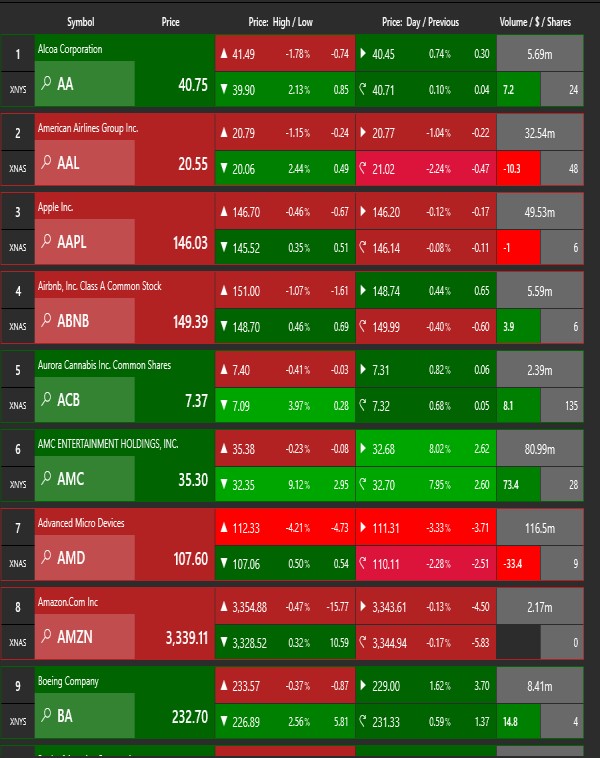 You can the see the complete information of each symbol in real time: Previous Price, Day price, Volume, etc...